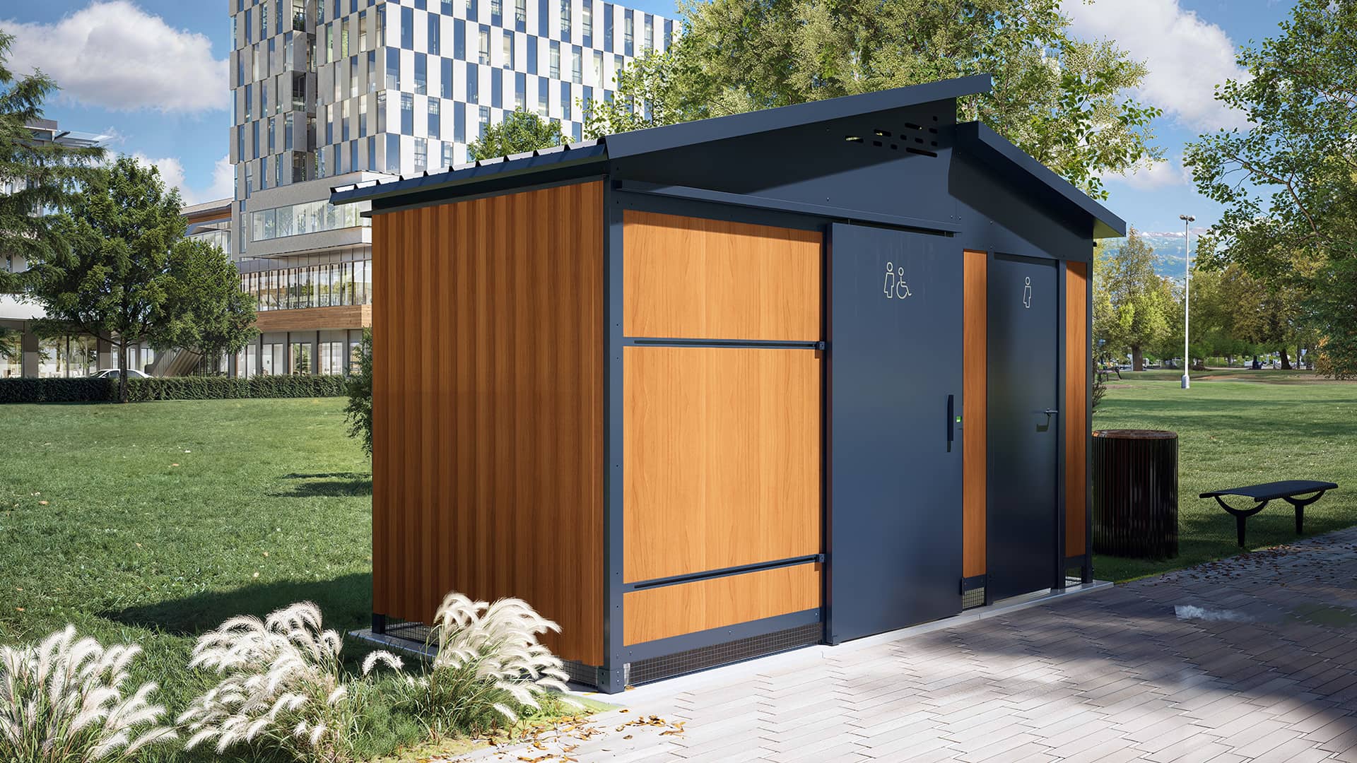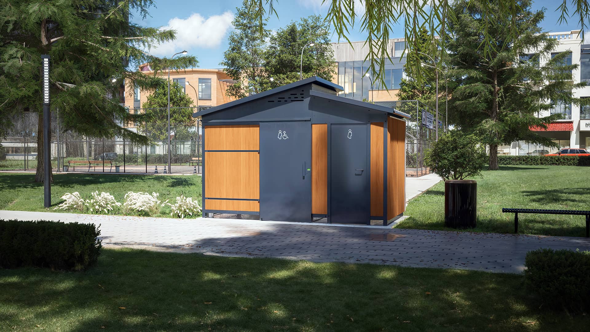 Furthermore, our public sanitation blocks are easy to maintain and do not require connection to a sewage system, making them perfect for isolated areas or areas with limited water access. Their modern and sleek design allows them to easily integrate into any environment, whether in nature or in the city.